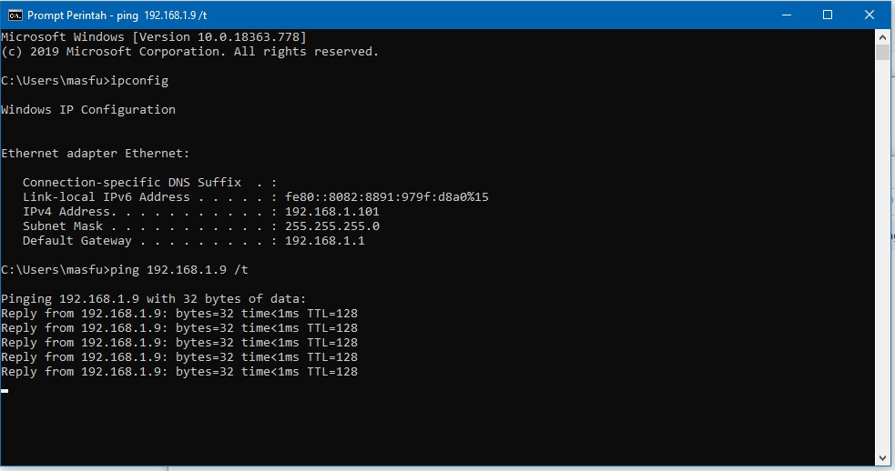 - Pastikan antara PC client dengan PC server sudah 1 Koneksi internet (lebih baik IP server sama client di isi manual(statis bukan dinamis) untuk cek ip di masing-masing pc bisa jalankan cmd, ketikkan “ipconfig” lalu tekan enter. Kemudian coba tes ping masing” pc untuk tester apakah kedua pc sudah terhubung, ketikkkan “ping ip pc yang akan di hubungkan] /t”