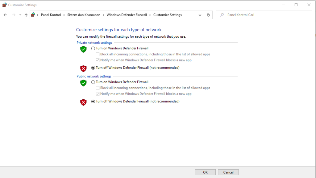 - Matikan Windows firewall ke 2 pc (server&client) , caranya klik start, ketik kontrol panel, sistem and security, anda cari windows defender firewall. Buka Turn Windows Firewall on or off dan off kan kedua nya seperti gambar dibawah ini setelah itu klik OK .