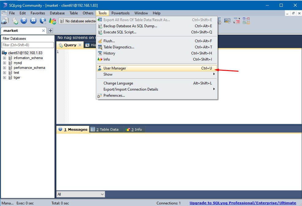 - Sekarang di PC Server buka Sqlyog dan login ,setelah login masuk ke Tab Tool, User Manager