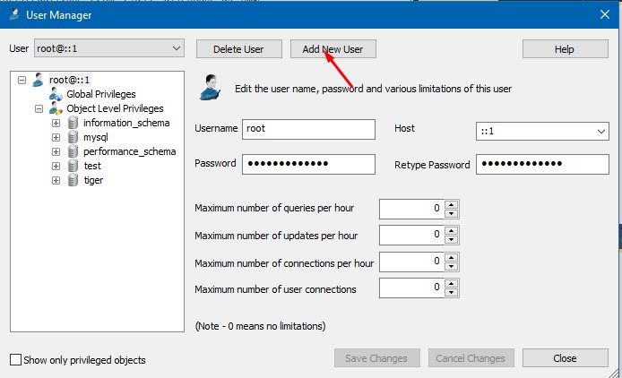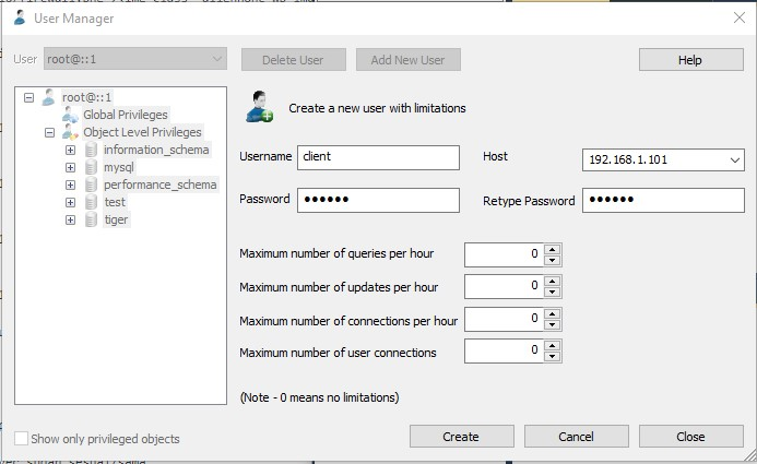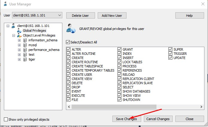 Buat user baru untuk Client , dgn cara klik Add New User dan isikan username, password, retype, dan host (utk host isikan IP lokal Pc client) , jika sudah klik Create dan akan muncul tab baru lagi . Silahkan centang Select all lalu save changes seperti gambar di bawah ini :