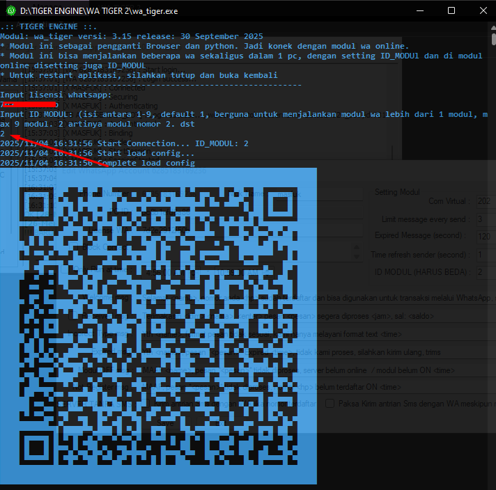 - buat folder baru, lalu download file wa tiger terbaru dan copy kan kedalam folder tersebut, jalankan wa tiger, input lisensi, id modul isikan 2 (sesuai di modul online) dan scan barcode wa web dari hp wa center suplier.