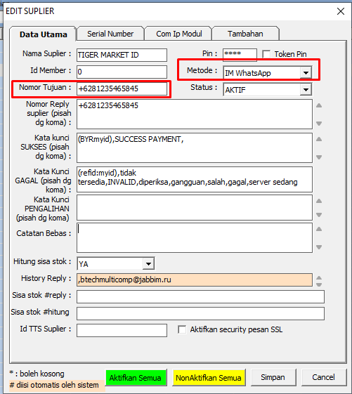 - di data suplier, nomor tujuan dan nomor reply suplier silahkan diisi nomor wa suplier h2h dengan awalan +62, metode transaksi pilih IM Whatsapp, lalu com ip modul arahkan ke com ip modul wa di modul online