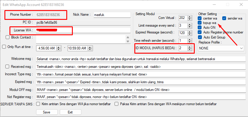- isikan id modul (id modul harus berbeda dengan id modul wa center yang digunakan untuk transaksi member)